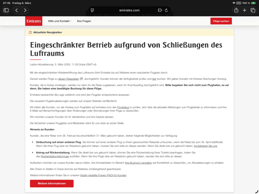 So, wir haben entschieden! Wir werden nicht mit Emirates über Dubai fliegen, sonder über Kuala Lumpur. Den Flug über Dubai haben wir zur Rückerstattung beantragt. Nun können wir entspannt über KL fliegen und nicht via eine Krisenregion. Danke Herr Trump, das war ja wieder eine super Idee, ich dachte, die Atomanlagen seien bereits zerstört, warum jetzt noch das? Zum Glück haben wir einen Plan B der jetzt noch fertig gebucht werden muss.
