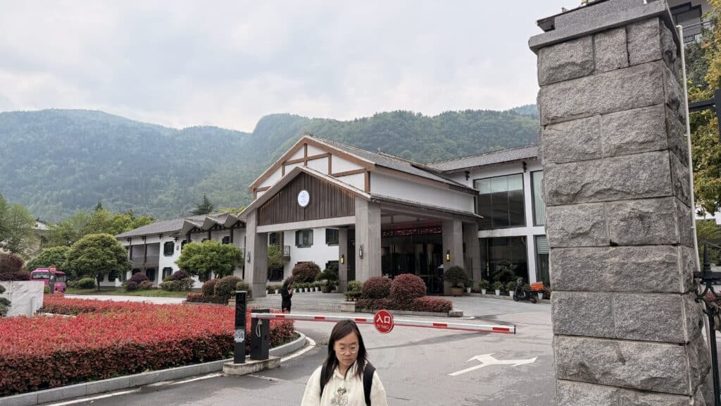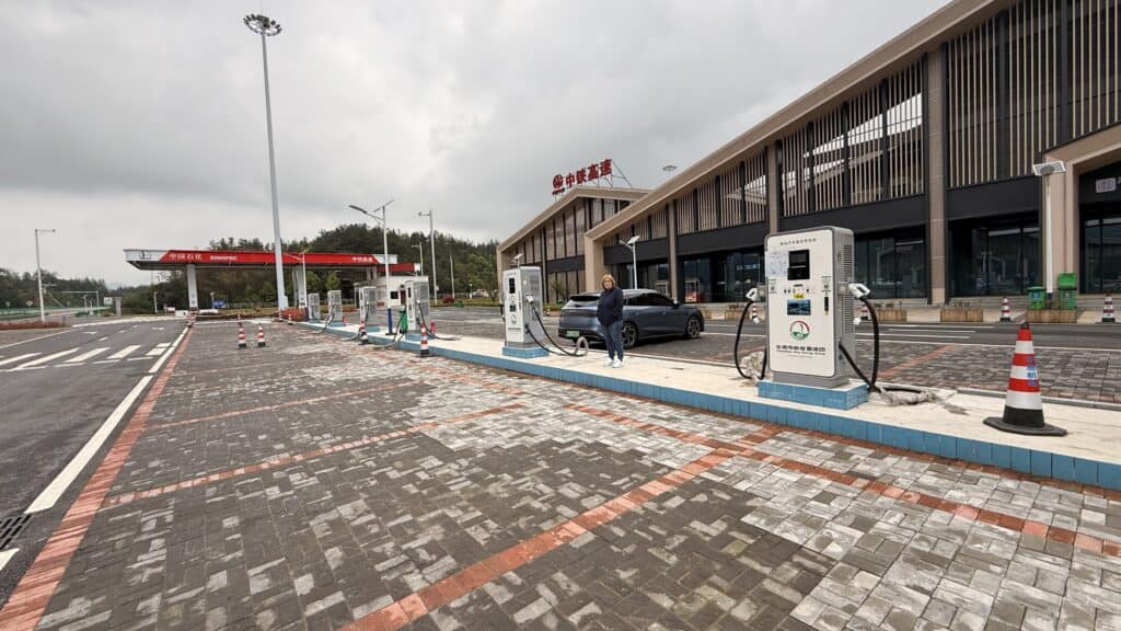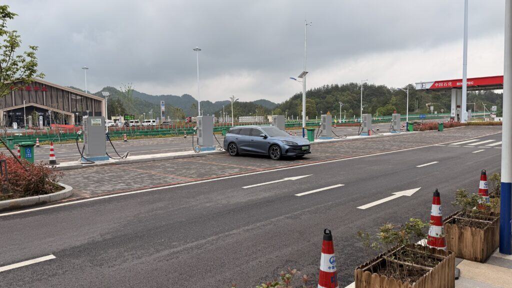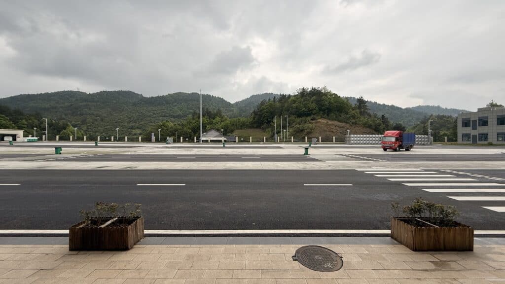 Dann geht es mit dem Bus eine Stunde zum Drei Schluchten Tourist Office. Cool, unsere Koffer stehen schon bereit. Unser Fahrer kommt ein bisschen später. Wir haben 4 Stunden Weg vor uns, unterwegs möchte der Fahrer das Auto kurz nachladen… kein Strom auf den Schnellladern. Es hat keinen Verkehr und die Raststätte gleicht einer Geisterstadt.