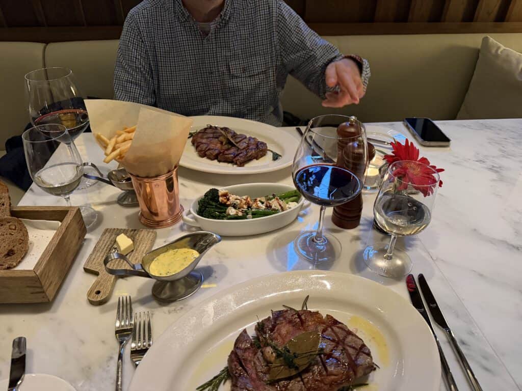 Nach den vielen Eindrücken kommen wir vom Bund wieder zurück, ein Grill Room macht uns noch an. Wieder mal ein Stück Fleisch und ein Schluck Wein passt jetzt gerade gut.