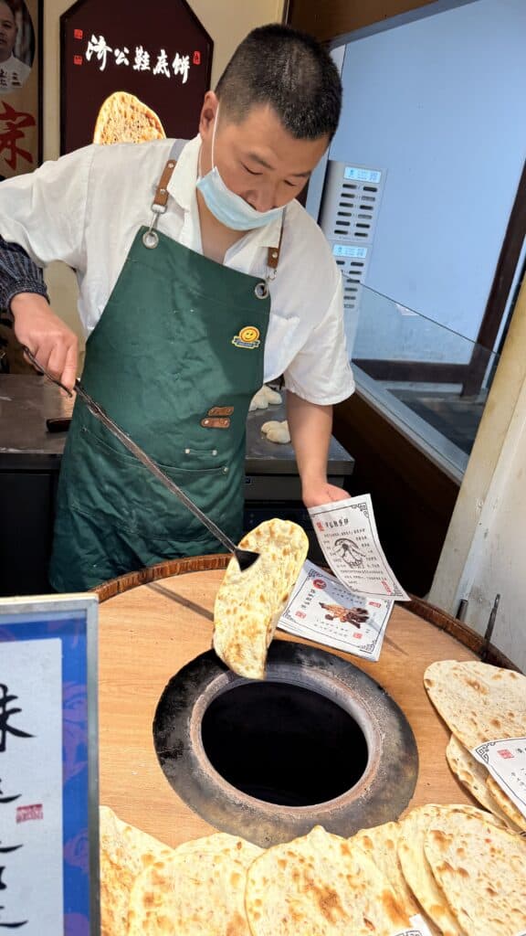 Markus sieht Teig auf einem Brett liegen, der imm einem Tandoori ähnlichen Ofen gebacken. So probieren wir das Fladenbrot.