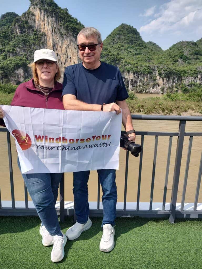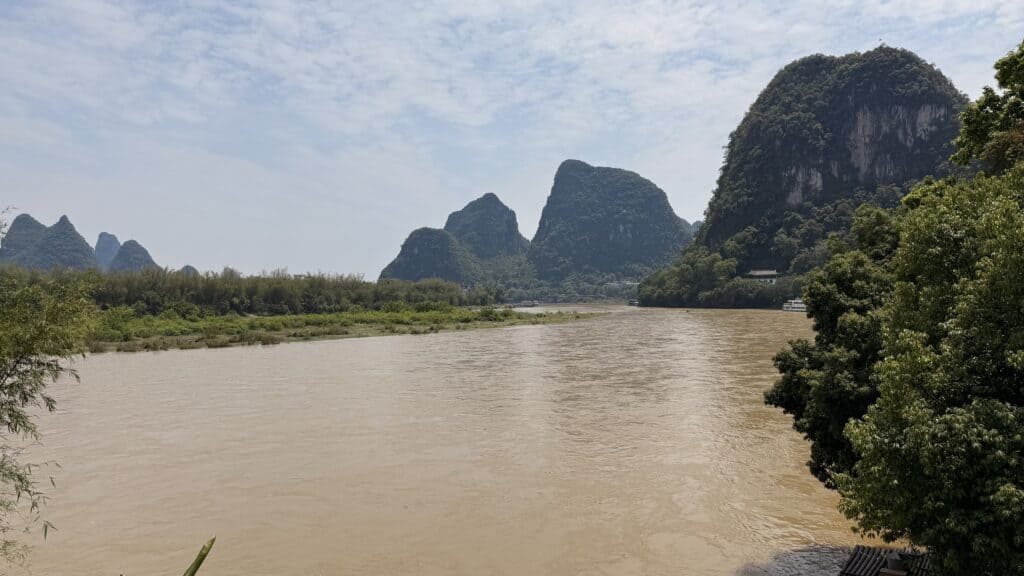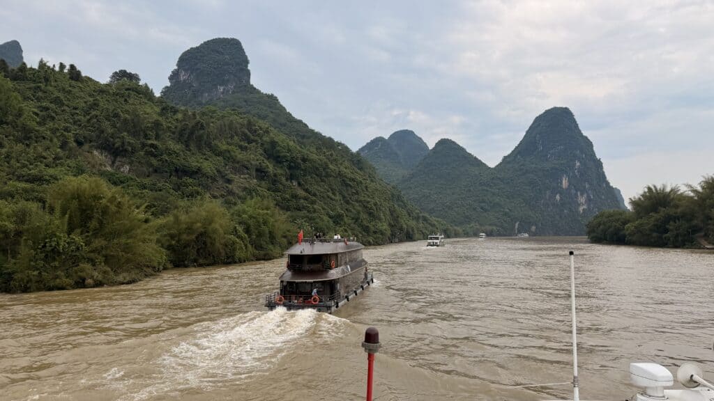 Um 8 Uhr geht es schon wieder weiter. Die Fahrt zum Schiff Terminal dauert eine knappe Stunde. Die Sonne scheint und es soll schön warm werden. Und natürlich sind wir wieder nicht allein. Bis zu 5’000 Touristen schippern täglich den Li Fluss entlang. Das sind also ca. 40 Schiffe. Aber mit dieser sehr guten Organisation geht hier alles sehr schnell. Wir sitzen bequem im 2. Stock zusammen mit einem Paar aus den Philippinen.