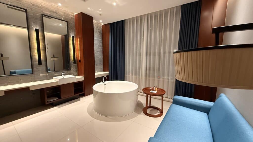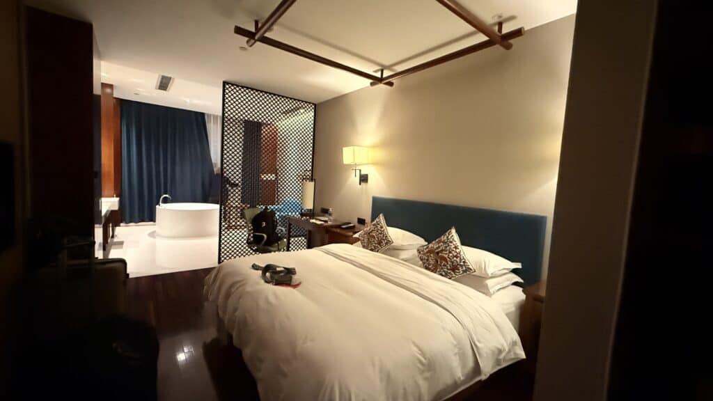 Der Fahrer kommt schon angerannt und bringt uns zum Hotel in der City. Wir bekommen ein Upgrade auf eine höhere Zimmerklasse mit einer runden Badewanne mitten im Zimmer, na ja wer‘s braucht.