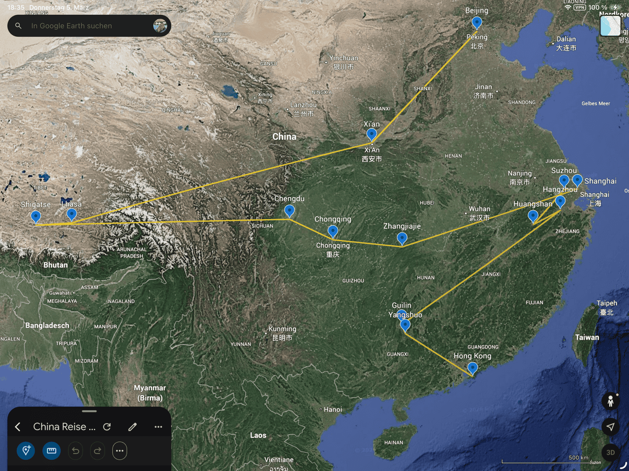 In April we are travelling to China and Hong Kong, you can take a look at our route here. We'll be travelling for a month, by plane, train, boat, raft, car and sometimes by bike.